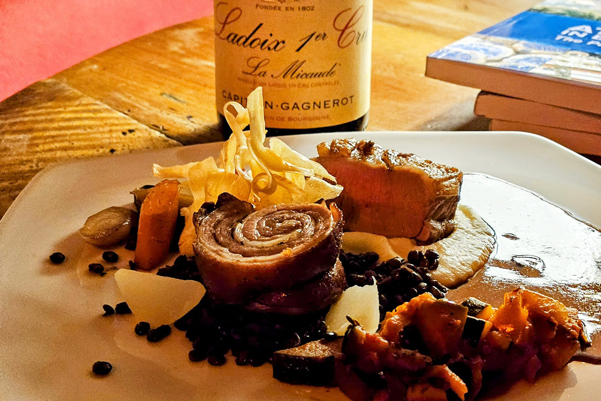 There are several notable beef dishes in the cookbook; the Warm Beef Carpaccio with Gorgonzola in particular. If cooked well, the beef and the cheese will both simply melt in the mouth. Over in Auxey-Duresses, Agnes Paquet makes a great Bourgogne Pinot Noir which will go with this dish, a classic from a producer whose attention to detail is second to none. It’s not too elaborate, and allows the meat to really sing. A good St Romain red would probably also make an appearance if this was served at Domaine de Cromey.